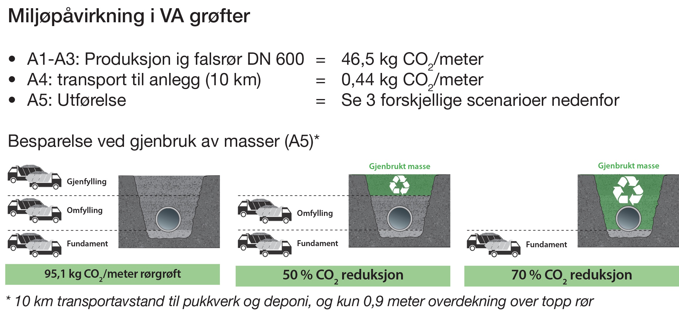 Velger du VARIG betongprodukter, og samtidig gjenbruker oppgravde masser som er enkelt å gjøre rundt betongprodukter, har du gjort tiltak som virkelig minimerer CO2 fotavtrykket ut fra et helhetlig LCA perspektiv. Dessverre ser vi alt for ofte at anleggene ikke optimaliseres ut fra et totalt miljøperspektiv, og at gjenbruk av oppgravde masser i alt for liten grad blir ivaretatt.