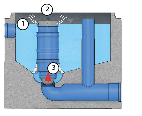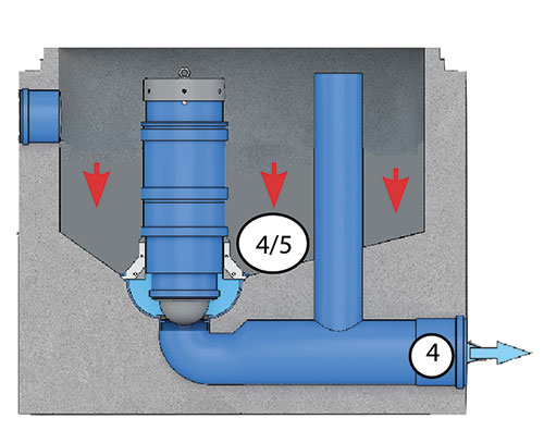 4 – Den tilknyttede avløpsledningen skylles og renses. Vannstanden i kummen synker.