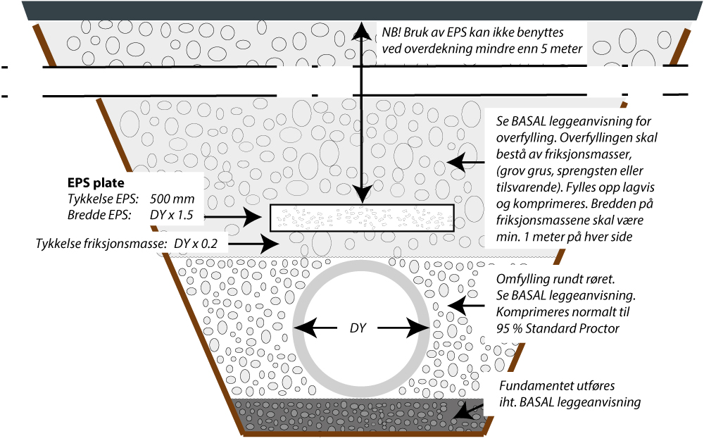 Det anbefales at EPS platen legges på friksjonsmasser med en tykkelse på minimum 0,2 ganger rørets utvendige diameter.