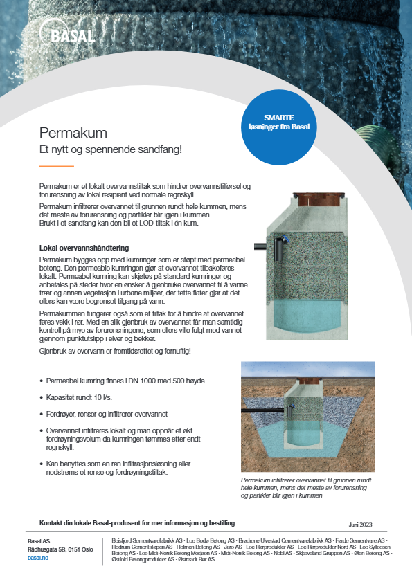 Permakum bygges opp med kumringer støpt med permeabel betong og standard kumringer. Den permeable kumringen gjør at overvannet tilbakeføres lokalt. Permeabel kumring DN1000 x 500, kan skjøtes på standard kumringer.