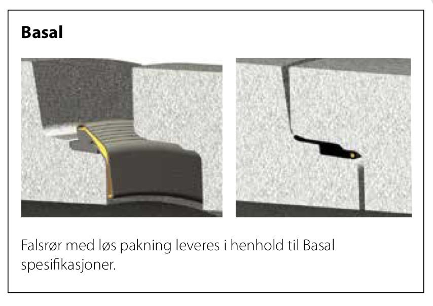 Basal falsrør har løs pakning som monteres på spissenden, og produseres fra DN1200 - 2000.